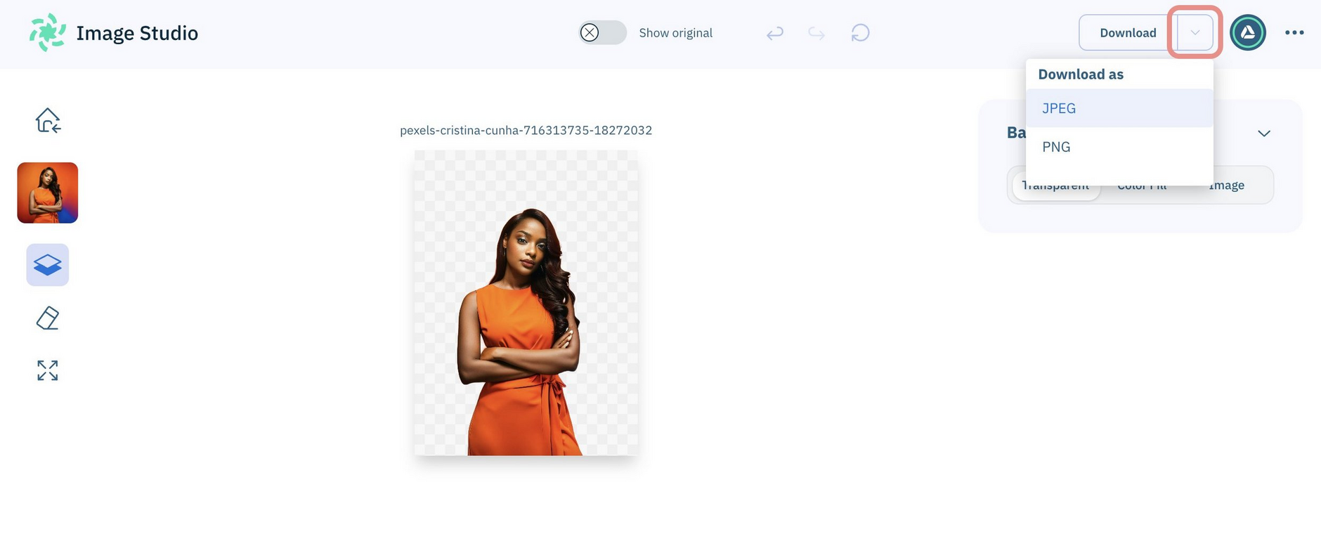 When you click "Download", Image Studio identifies the appropriate format to use for the download file, and by default, converts any JPEG file that has transparency, into a PNG file for you. More about why JPEG files are converted to PNG.